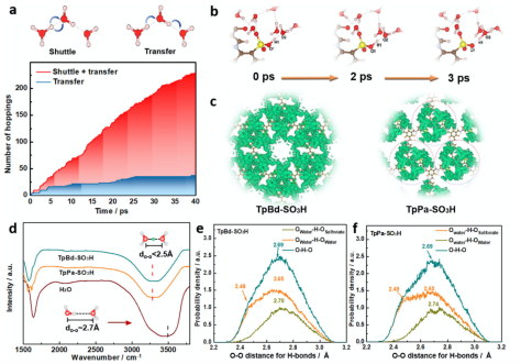 研究结果表明,磺酸基团周围形成局域化的水合质子域,在30℃100%相对湿度条件下每个水合质子域中的水分子数目为6~7个。当磺酸基团间距从1.4 nm缩减至1.0 nm时,COF膜面内的质子传导率提升近6倍当磺酸基团间距小于1.0 nm时,质子传导率随离子交换容量(IEC)的线性关系与基团间距大于 1.4 nm时相比有显著差异,表明基团间距小时氢键网络的形成从而导致质子传递行为改变。采用真空辅助自组装方法制备的COF膜可以保证纳米片层层组装,使之具有良好的取向性,有利于氢键网络的形成从而实现质子跨越传递。而当两个片层疏松堆叠时,难以形成连续的氢键网络,从而造成质子传递受阻。计算模拟结果表明,质子在磺酸基团周围分子之间迁移主要以“穿梭”模式为主,证实水合质子域中的质子限域效应红外光谱测试和计算模拟共同证实了水合质子域中存在高浓度的短氢键,且当磺酸基团间距减小至1.0 nm时COF膜表面形成了联通的短氢键网络,这是实现超高质子传导率的最主要原因。该工作所提出的表面限域短氢键概念可以新一代高性能离子交换膜的开发提供理论指导和借鉴