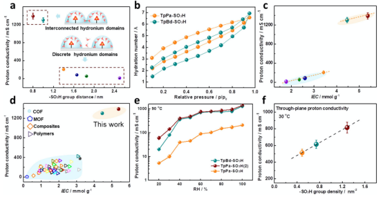 基于上述设计思路,williamhill官方网站深圳研究生院潘锋教授团队与天津大学化工公司姜忠义教授团队共同研制出具有超高质子传导率的离子型COF膜。通过膜上的磺酸基团实现水合质子的表面局域化,并通过调节磺酸基团的间距实现短氢键网络的联通,最终所制备的COF膜90℃100%相对湿度条件下,质子传导率可达1389 mS cm-1,为目前所见报道的最高值。该工作以Short hydrogen-bond network confined on COF surfaces enables ultrahigh proton conductivity”为题发表于《自然•通讯》(Nature Communications2022,13:6666)