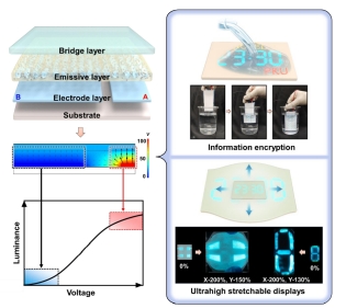 另一个超可拉伸电致发光显示器件。我们进行了各种可拉伸图案和阵列显示的实验,实现了可拉伸电致发光显示领域最高的拉伸性能,其中可拉伸的七段式显示器件在面积为原始状态的7.5倍时仍然可以工作。更重要的是,与传统的三明治超高可拉伸交流薄膜电致发光器件相比,非对称增强的共平面电极交流电致发光器件由于发光层将共平面电极和凝胶相互隔离起来,具有非常优异的电化学稳定性。器件可以稳定工作在高交流电频率和高电压下以实现高亮度和广色域。