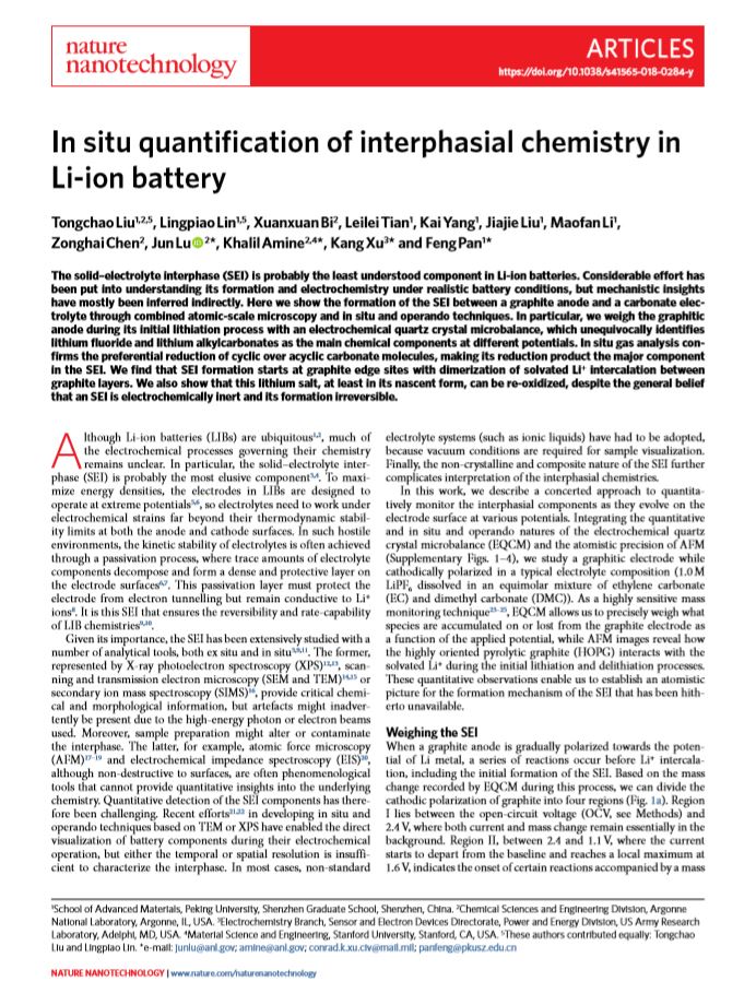 williamhill官方网站深圳研究生院WilliamHill中文官方网站潘锋教授组发表在NATURE NANOTECHNOLOGY的论文“In situ quantification of interphasial chemistry in Li-ion battery”入选2019年“中国百篇最具影响国际学术论文”。该工作是将电化学方法与称量原子/分子重量石英微天平(EQCM)、观察原子尺度形貌的原子力显微镜(AFM)和监测极微量气体组成的微分质谱(DEMS)进行巧妙协同联用,在原子尺度原位实现不同电位下电极界面组分的定量监测,阐明锂电池负极界面重构稳定固态电解质界面(SEI膜)的机理,解决了长期困扰业界的难题,为锂电池及材料优化设计提供了的科学指导依据。