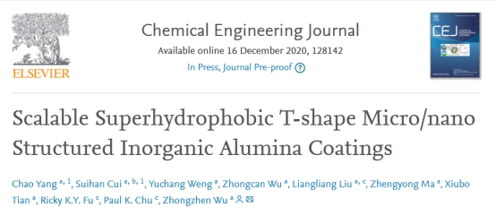 相关工作以题“ Scalable Superhydrophobic T-shape Micro/nano Structured Inorganic Alumina Coatings”的文章发表在化学工程领域顶级期刊 Chemical Engineering Journal上。该工作是课题组针对第三代纯无机超疏水材料研究的系列工作之一,结合之前发表在《Research》期刊上的θ-Al2O3相超疏水涂层材料,正式揭开了常规等离子体电解氧化技术简单制备超疏水纯无机陶瓷涂层的序幕!