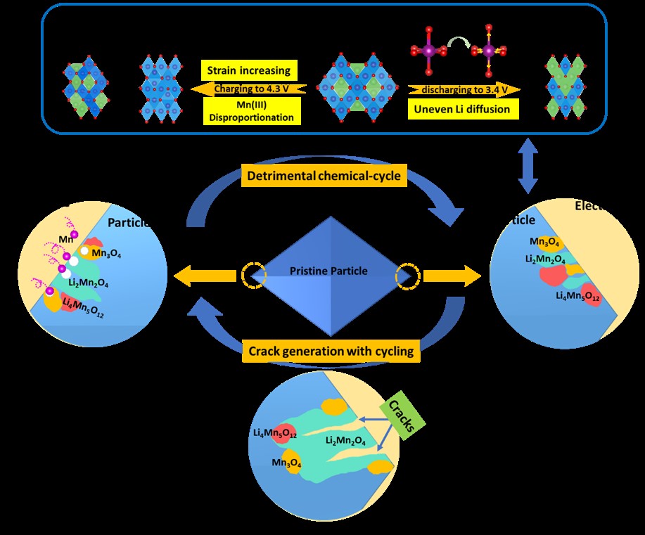 实验结果表明: LiMn2O4结构的不可逆相变与过渡金属的协同作用是导致容量衰减的主要原因。在充电过程中,LiMn2O4会在高电位时发生歧化反应从Mn3+变为Mn2+和Mn4+,并且伴随着不可逆相变产生非电化学活性Mn3O4和Li4Mn5O12。其中Mn3O4被确认是电化学可溶相,它的生成将加速过渡金属的溶解。放电过程中,由于过渡金属溶解后界面大量地缺陷导致了锂离子的不均匀扩散,引发了另一个相变并生成Li2Mn2O4。这种相变过程中,材料的晶胞体积变化较大,从而导致颗粒裂缝的产生,进而再一次加速过渡金属的溶解。
