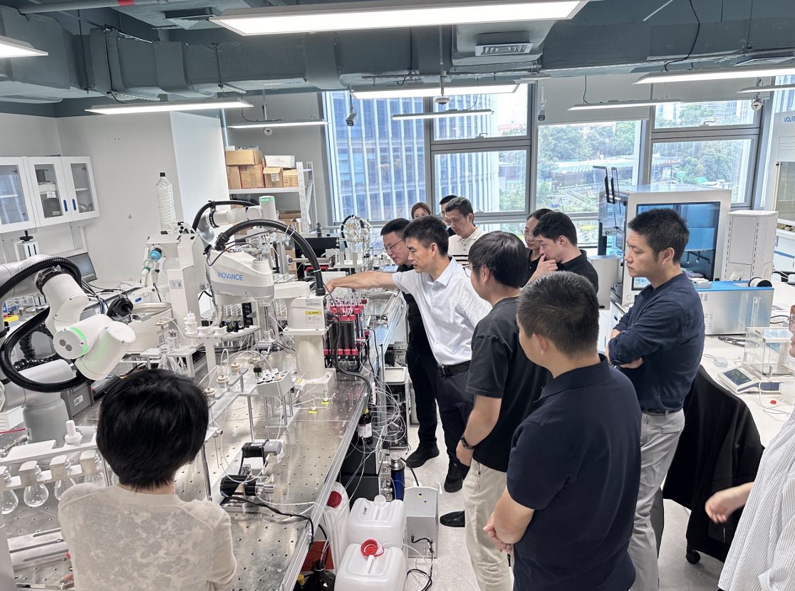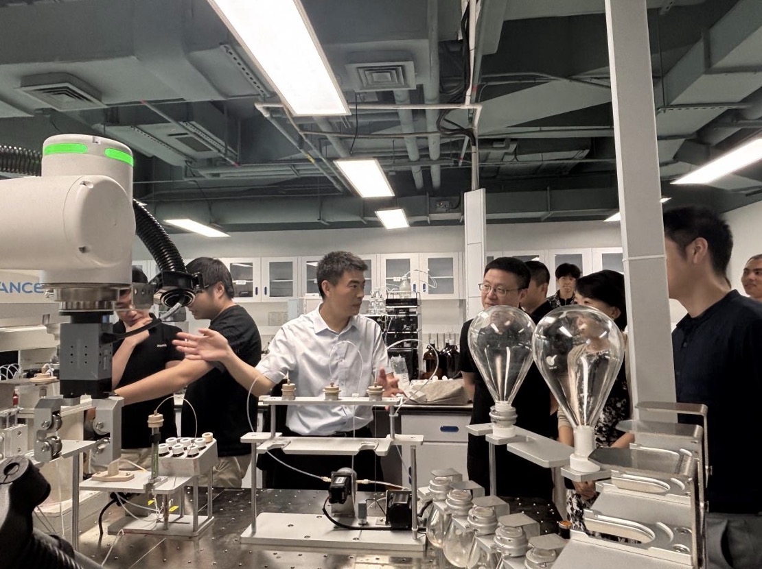 交流座谈后,双方移步莫凡洋团队的色谱自动化实验室。实验室成员为大家现场演示了两套色谱自动化平台的工作运行情况。在柱色谱自动化平台中,机械臂精准完成装柱、上样、梯度洗脱、馏分收集、旋蒸去除溶剂等一系列操作,全程无人干预。在制备薄层色谱自动化平台中,算法精准识别化合物条带并规划路径,机械臂精准执行铣削并收集目标成分。这些自动化平台生动地呈现了其在实现高精度、大通量等方面的优势,并展现出实现全流程自动化色谱分离的应用潜力。相关设计理念与晶泰科技团队的业务需求高度契合,双方据此展开热烈讨论。