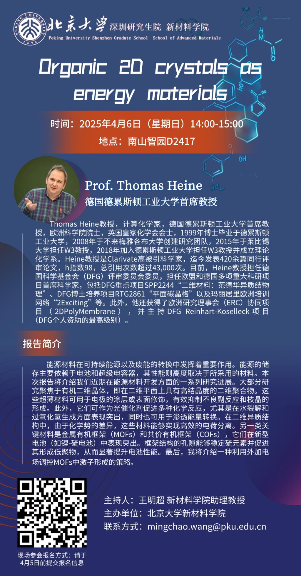 能源材料在可持续能源以及废能的转换中发挥着重要作用。能源的储存主要依赖于电池和超级电容器,其性能则高度取决于所采用的材料。本次报告将介绍我们近期在能源材料开发方面的一系列研究进展。大部分研究聚焦于有机二维晶体,即在二维平面上具有高结晶度的二维聚合物。这些超薄材料可用于电极的涂层或表面修饰,有效抑制不良副反应和枝晶的形成。此外,它们可作为光催化剂促进多种化学反应,尤其是在水裂解和过氧化氢生成方面表现突出,同时也可用于渗透能量转换。在二维异质结构中,由于化学势的差异,这些材料能够实现高效的电荷分离。另一类关键材料是金属有机框架(MOFs)和共价有机框架(COFs),它们在新型电池(如锂-硫电池)中表现突出。框架结构的孔隙能够稳定硫元素并促进其形成低聚物,从而显著提升电池性能。最后,我将介绍一种利用外加电场调控MOFs中激子形成的策略。