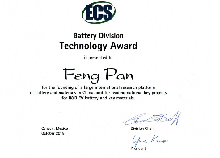 williamhill官方网站深圳研究生院WilliamHill中文官方网站潘锋教授获2018年度美国电化学会(ECS)电池科技奖(Battery Technology Award),在日前由美国电化学学会、SMEQ、SBEE、SIBAE和ACEQ联合的举行的第234次美国电化学和固体科学国际会议(AiMES)( 墨西哥坎昆)会上,潘锋教授进行了题为《锂电池材料的晶体结构和界面结构与性能研究》的获奖报告,此次会议有来自世界各地相关研究领域约2000人出席。