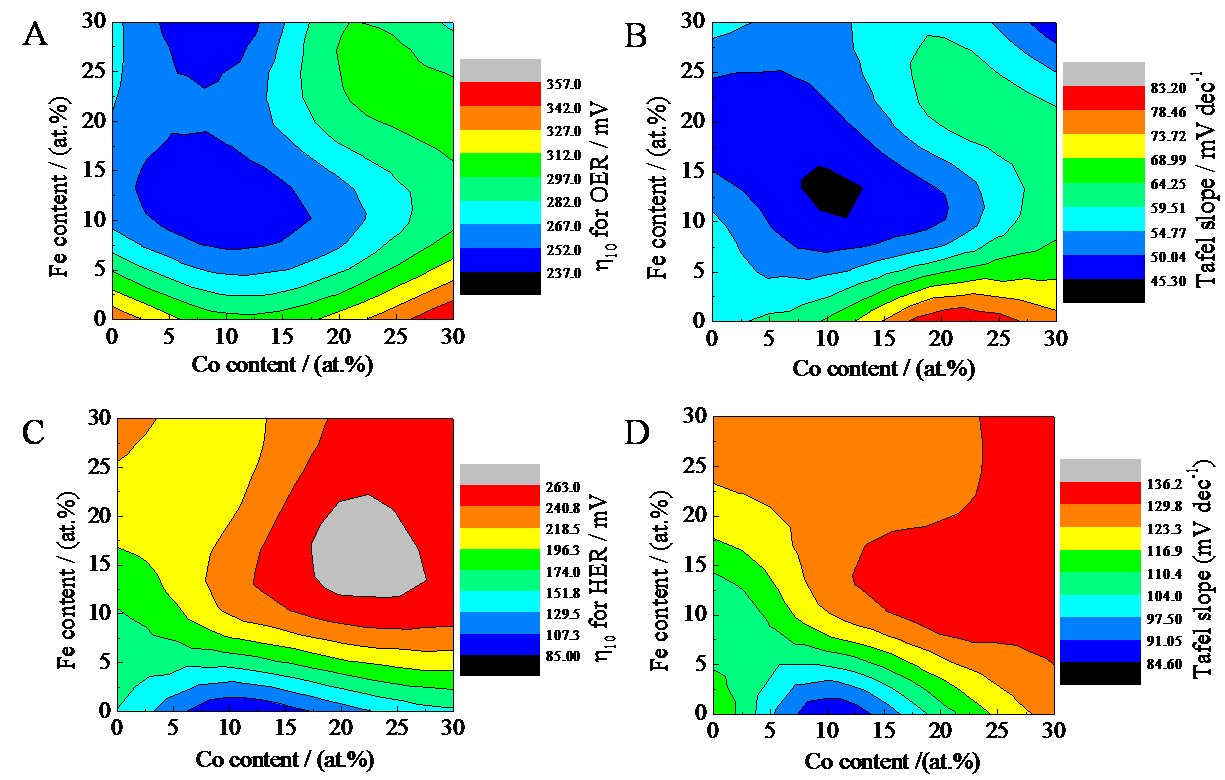 图一 Ni基催化剂1M KOH中的OER/HER性能。OER过程η10(j=10mA·cm-2时的过电位)(A)和Tafel斜率(B)随Fe和Co掺杂含量的变化图;HER过程η10(C)和Tafel斜率(D)随Fe和Co掺杂含量的变化图