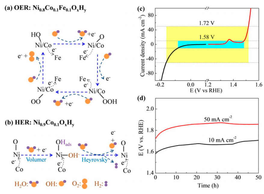 图二 (a)Fe掺杂的拉电子作用对OER性能影响机理,(b)Co掺杂的推电子作用对HER性能影响机理,(c)全电解池在10和50 mAcm-2条件下水分解的电解槽槽压和(d)50h的稳定性曲线