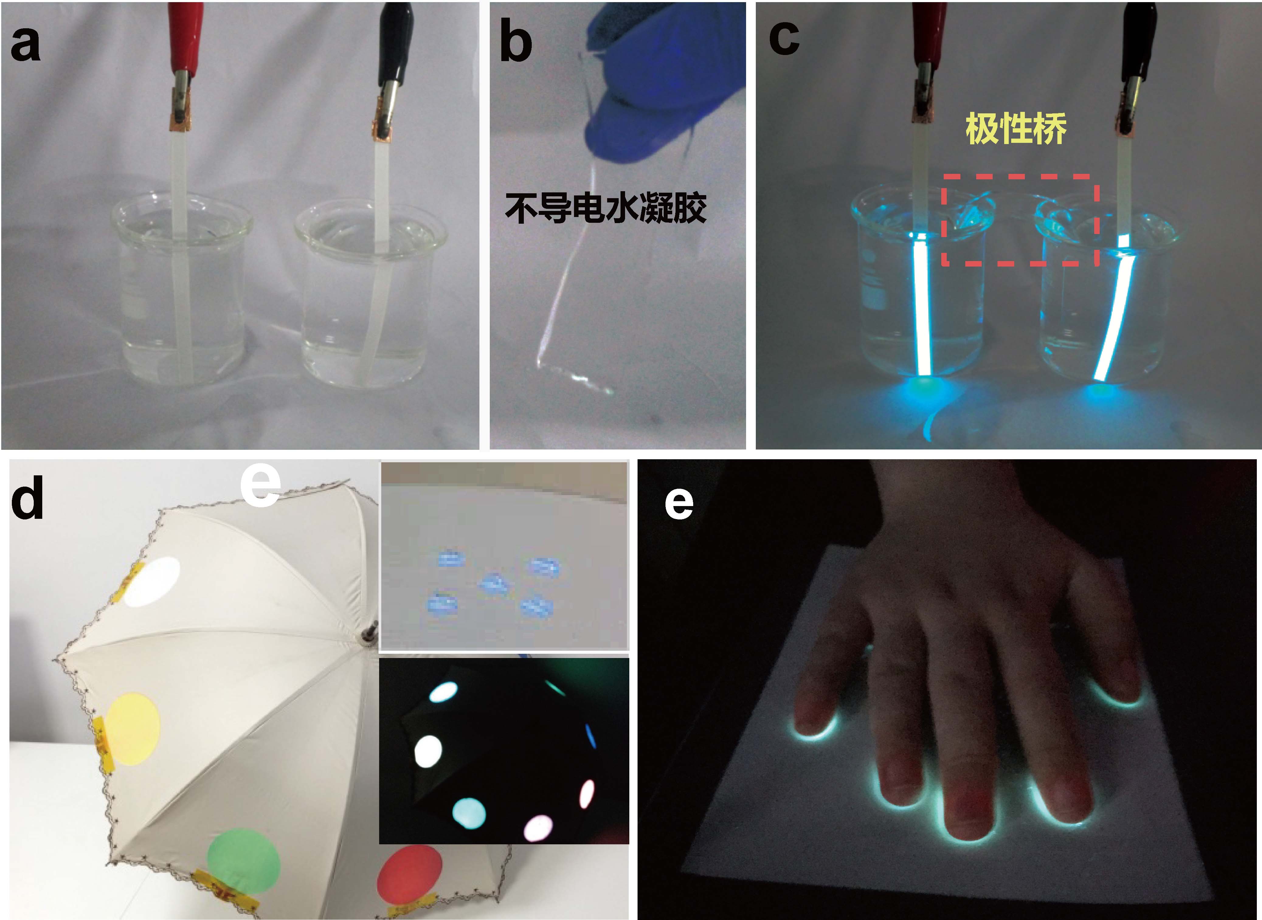 图2. (a) 2个独立的半个器件;(b) 不导电去离子饱和的水凝胶;(c) 水凝胶作为“极性桥”使2个半器件工作发光;(c) 印制有新型器件的伞,伞被雨水打湿,伞印制有器件的部分即发光; (d) 手与器件接触的部分发光。