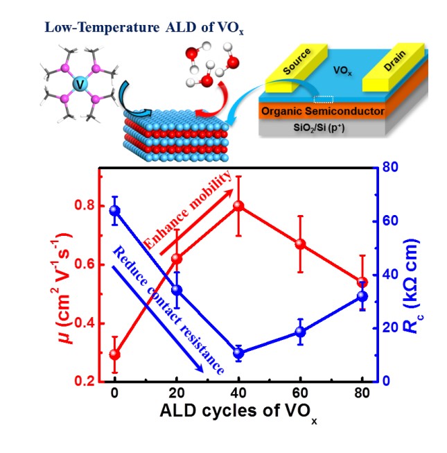 近日,为了解决有机电子器件电荷注入效率低的普遍性问题,该课题组针对有机材料的特殊性,开发了一种温和的低温ALD工艺,可以在接近室温(50摄氏度)实现氧化钒电荷注入薄膜层的ALD可控制备,从而在避免损伤有机材料的同时,显著降低金属与有机层间的接触电阻。
