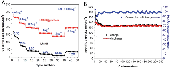 图2 (a)不同倍率下,硅酸亚铁锂和石墨烯复合材料的容量体现,并与未符合的硅酸亚铁锂纳米棒作对比。(b)硅酸亚铁锂和石墨烯复合材料的寿命性能(2A g-1下,循环240次)。