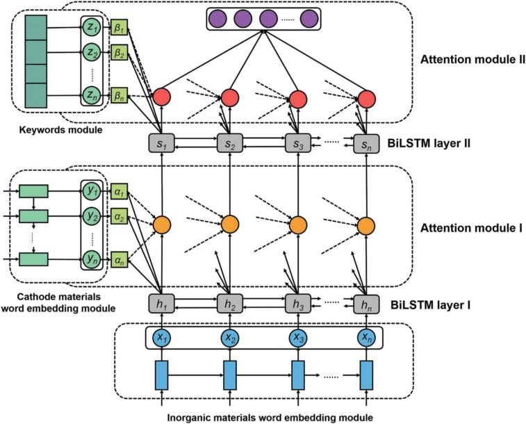 研究团队发展了一套名为DATWEM的材料信息语义表示框架以针对性生成特定子领域的材料实体表示,解决了复杂材料系统中的材料实体挖掘问题。该框架结合BiLSTM和双重注意力机制,通过多源信息融合提高词嵌入的质量以对材料科学文献中的特定领域材料实体进行精准挖掘。团队将该框架应用于锂离子电池正极材料领域知识图谱的构建:首先对材料科学文本信息进行向量化,接下来使用两个独立的词嵌入模块对两种不同语料库(无机材料语料库和正极材料语料库)分别进行编码,两种语料库编码后的词嵌入和关键词模块的词嵌入随后会被输入DATWEM框架经过双层注意力模块实现多源信息融合,增强材料实体的表示质量,最后量化材料实体之间的相似度以构建锂离子电池正极材料知识图谱。