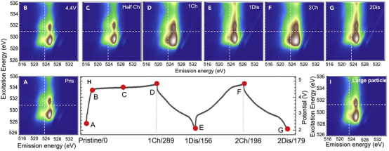 最后,通过对富锂材料、传统层状材料(NCM111,LiCoO2,LiNiO2)和Li2MnO3晶格氧电子态对比(图3)研究表明富锂化合物中的晶格氧氧化还原反应与传统非富锂层状化合物中的晶格氧氧化还原反应性质相同;然而,Li2MnO3并不存在可逆的晶格氧氧化还原反应。晶格氧氧化还原反应是传统层状材料的固有性质,“富锂”结构更多是调控不可逆氧释放反应进行。
