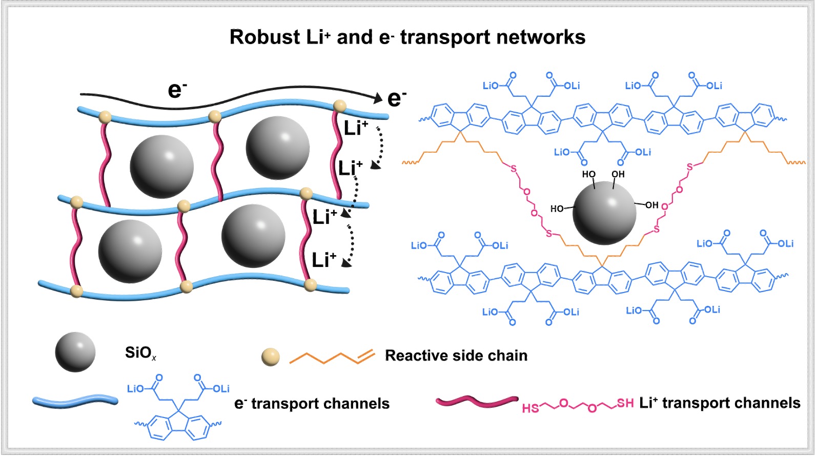 氧化硅(SiOx,0<x<2)材料以其高比容量和低氧化还原电位而著称,是石墨负极最有前途的替代者之一。然而,其实际应用受到循环过程中体积的大幅变化 (约翻倍)和其导电性差等因素的影响。我们之前的研究揭示了SiOx不受限制的膨胀-收缩过程导致固体电解质界面 (SEI) 增厚,并最终导致电子渗透网络的击穿(Nat. Comm., 2023, 14, 6048)。为了缓解这种情况,构建具有高机械强度的导电聚合物网络对于提升电池体系导电性和稳定SiOx和防止体积引起变化的电子和锂离子(e-/Li+)传输网络崩溃至关重要。遗憾的是,现有的粘合剂无法同时满足这两个要求。受刚性共轭结构约束的导电聚合物通常具有较低的机械强度,无法适应SiOx的体积变化。预交联导电聚合物可以提高机械强度,但这反过来又会导致其溶解度变差,从而影响负极颗粒的分散性。