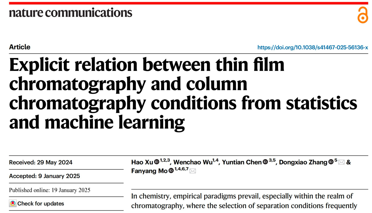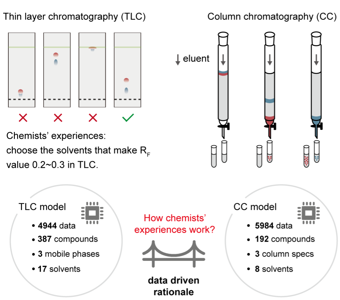近日,公司莫凡洋团队与东方理工大学张东晓团队合作,通过结合统计学和机器学习方法,首次明确揭示了薄层色谱(TLC)与柱色谱(CC)之间的量化关系。该研究提出了一种知识发现技术、建立了可解释的公式,将专家经验(Chemist’s experience)转化为“人工智能经验”(AI experience),为色谱分离实验条件的确定与优化提供了理论支持。相关成果发表于《自然·通讯》(Nature Communications)。