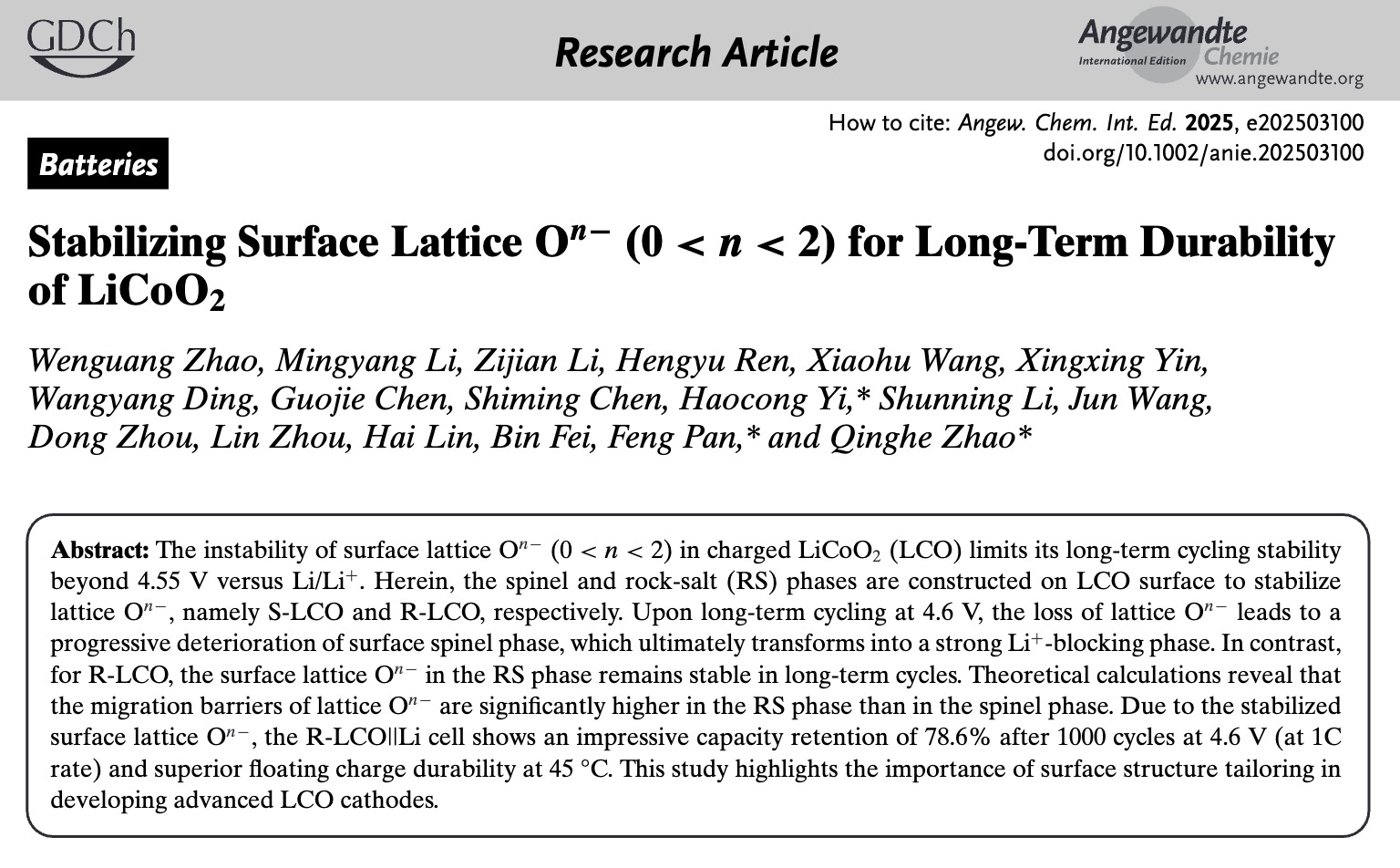 近日,williamhill官方网站深圳研究生院WilliamHill中文官方网站潘锋/赵庆贺团队取得重要研究进展,通过调控表面Li+含量,在LCO表面构建尖晶石相(S-LCO)和岩盐相(R-LCO),结合循环后表面相表征、价态分析与氧空位形成/迁移的理论计算,阐明了两种表面相对晶格On-稳定性的差异。研究发现,在4.6 V下长期循环过程中,LCO表面的尖晶石相因晶格氧损失逐渐退化,最终转变为较厚的Li⁺阻挡相结构;而R-LCO表面岩盐相中的晶格氧在循环中保持长效稳定,保障了表面Li+的稳定脱嵌。理论计算表明,岩盐相中晶格氧的迁移势垒显著高于尖晶石相。得益于表面晶格氧的稳定化,R-LCO||Li电池在4.6 V电压下以1 C电流循环1000次后容量保持率高达78.6%,并在45℃浮充测试中表现出优异的耐久性。该研究揭示了表面结构调控对提升LCO正极性能的重要性,为开发先进高压LCO正极提供了新思路。相关研究成果以“Stabilizing Surface Lattice On- (0<n<2) for Long-Term Durability of LiCoO2”为题,发表于国际顶级期刊《德国应用化学》(Angewandte Chemie International Edition,影响因子16.8)。