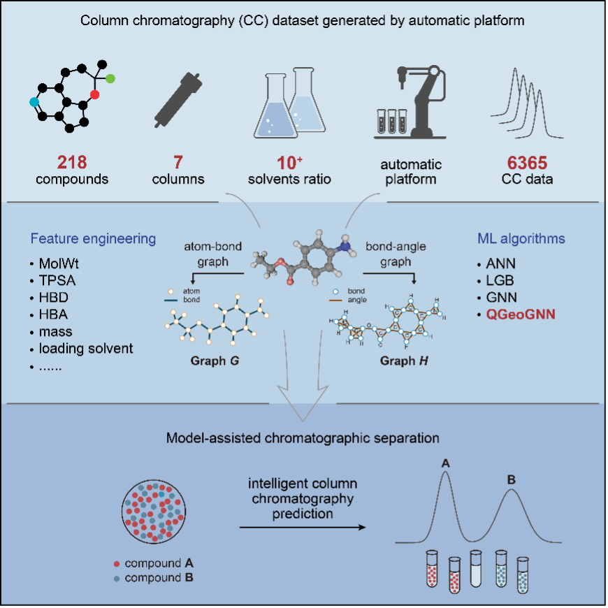 针对以上问题,研究团队创新性地开展了柱层析机器学习预测模型研究。团队首先搭建了自动化实验平台,系统采集了218种有机化合物在6365次柱层析实验中的保留体积数据,构建了包含分子结构特征、洗脱剂比例、上样质量、层析柱规格等多维实验参数的标准化数据集。这种数据采集方法实现了传统经验依赖型分离过程向定量化、标准化科学问题的转化。