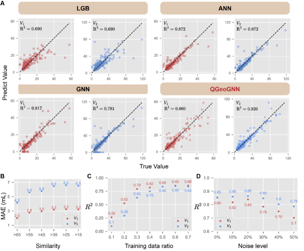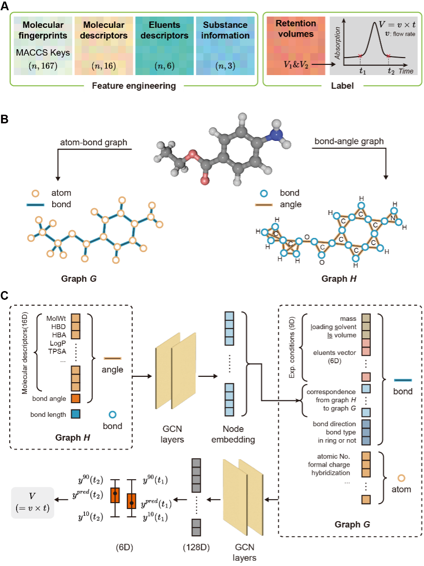 基于此数据集,研究团队开发了分位数几何增强图神经网络(QGeoGNN)模型。该模型通过构建原子-键图(GraphG)和键-角图(GraphH)双重图表征,实现了分子三维结构特征与实验条件的协同建模。其中,原子-键图精确描述分子拓扑结构,键-角图则有效捕捉分子空间构型特征。研究首创性地将实验参数嵌入图神经网络的边特征,使模型能够同时考虑分子特性和实验条件的影响。验证实验显示,该模型对保留体积的预测决定系数R²达0.9以上,显著优于传统经验方法。此外,模型采用的分位数学习技术还可提供预测结果的置信区间,为实验设计提供科学依据。
