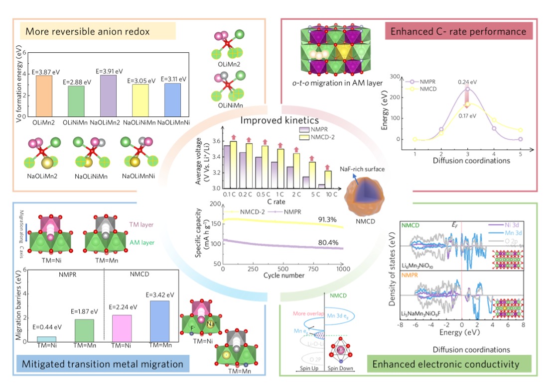 通过理论计算,团队深入研究了 Na⁺/F⁻ 协同提升材料动力学的机制。研究发现:Na⁺/F⁻ 掺杂显著提高了氧空位在 Li-O-Li 构型中的形成能(由 3.87 eV 升至 3.91 eV),并 大幅提升了过渡金属(TM)沿 c 轴的迁移能垒(Mn 从 1.44 eV 升至 2.24 eV;Ni 从 1.87 eV 升至 3.42 eV)。此外,Na⁺ 在碱金属层中的掺杂有效降低了 Li⁺ 扩散能垒(从 0.24 eV 降至 0.17 eV),而 F⁻ 对晶格氧的取代则通过诱导 Jahn-Teller 效应显著提升了电子电导率。研究证实,Na⁺/F⁻ 在解除富锂锰基正极动力学限制方面展现出以下四重协同机制:1) 抑制氧空位形成;2) 阻碍 TM 迁移;3) 加速 Li⁺ 扩散;4) 增强电子传导。这些研究成果为无钴LRMO材料在未来电网规模储能及电动汽车等产业中的应用提供了重要支撑。
