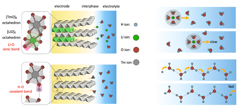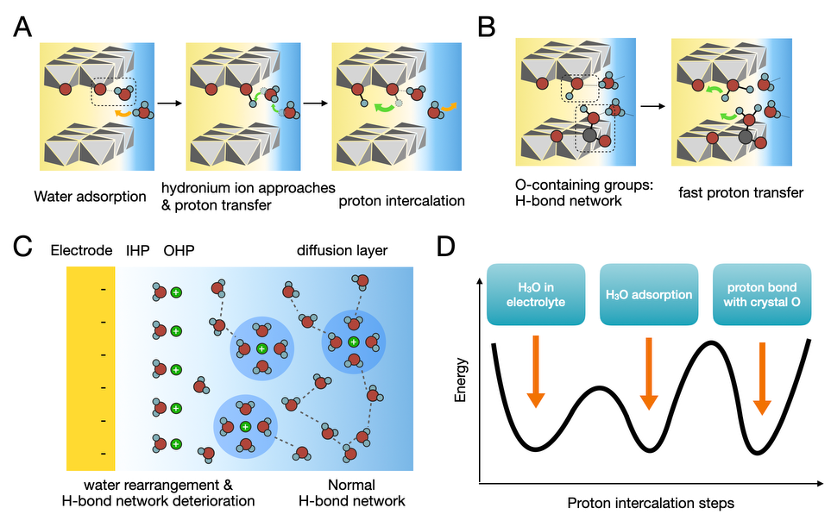 质子存储与传输行为与传统金属阳离子存在显著差异,其核心在于质子独特的成键方式:与Li-O 和 Na-O相比,H-O 键共价性更强且具有饱和性,因此质子无法像金属离子那样与O离子形成连续稳固的晶体框架,而倾向于作为间隙离子附着于O离子上。此外,质子可通过氢键与其他电负性原子形成弱相互作用。这种灵活的氢键网络使质子具备Grotthuss传输特性——通过O-H···O氢键与O-H共价键的快速转换,实现质子超高速传输(又称“无扩散传输”),其能垒远低于需携溶剂化壳层穿越氢键网络的传统金属离子。这种独特的成键方式使通过调控电池材料中的氢键网络结构来增强质子参与度、提升电池性能成为可能。
