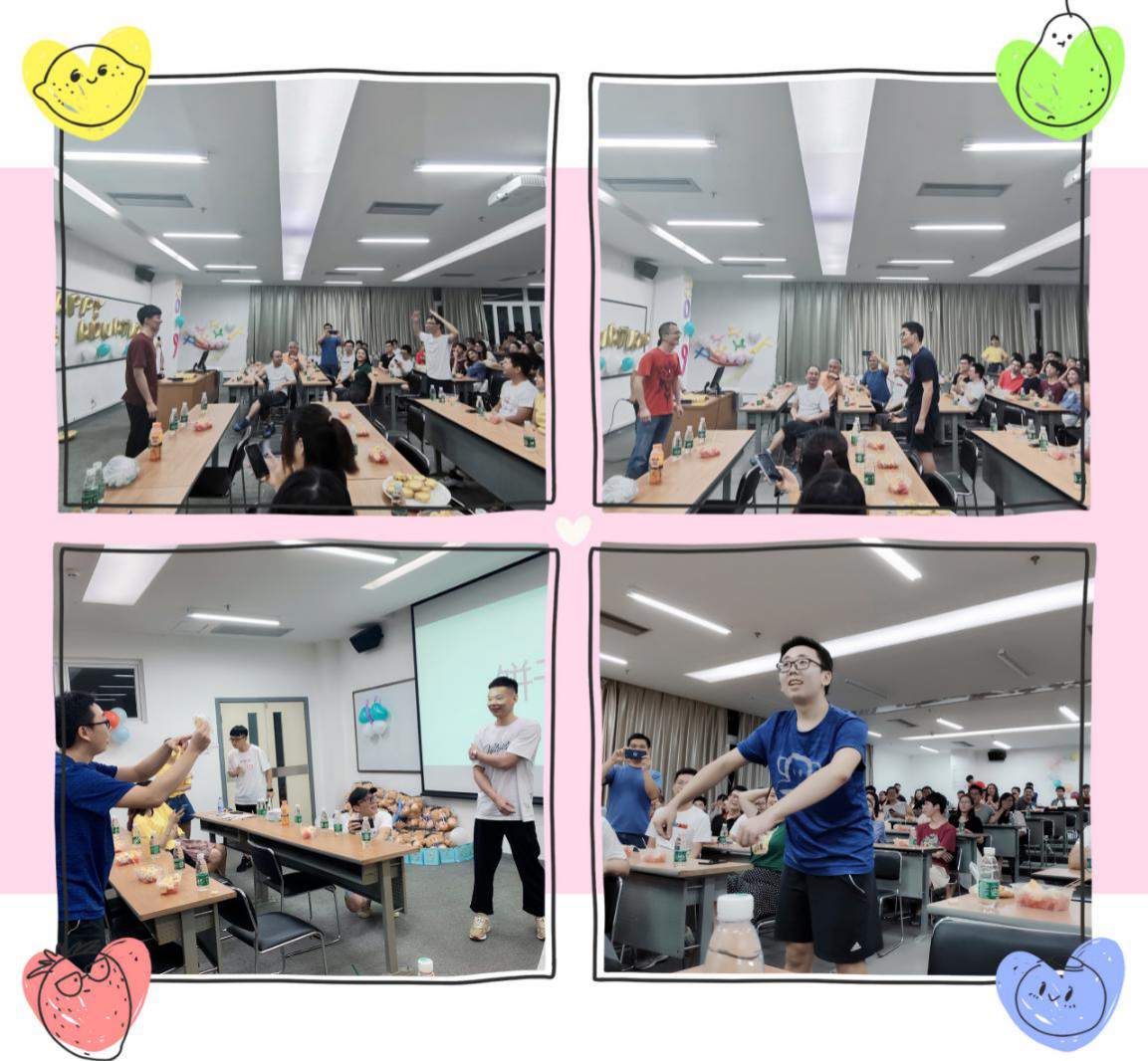 第一个游戏“你画我猜”:设置13个词语,两两同学配合,一人比划一人猜词,动作千姿百态,笑料频出,现场高潮频频,掌声雷动。第二个游戏“叠报纸猜拳”,2人一组,两组PK,划拳输的一方将报纸对折一半,直至一方“无立足之地”另一方判为获胜。第三个游戏“黑箱子游戏”,准备各种各样的物品,放入黑匣子,选手通过触觉感知并描述物品名称,猜错扣分,猜对得分。游戏让大家很好的互动起来,不仅上台参与游戏的人开心不已,观众们也看得是“津津有味”。
