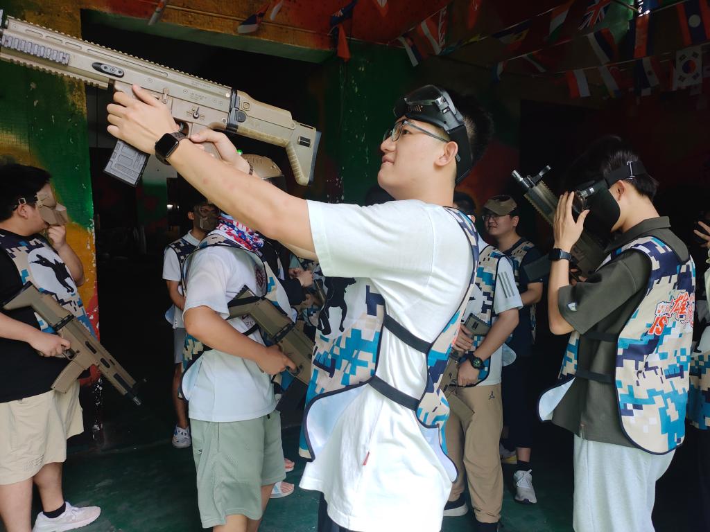 师生来到东纵文化体验基地,穿上了迷彩服,戴上头盔,手持仿真枪,模拟东纵队保护历史文物和爱国人士的场景。