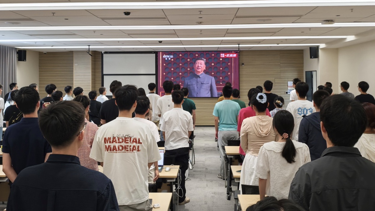 大会庄严肃穆,气势恢宏,全面展现了中国人民抗日战争和世界反法西斯战争的艰苦卓绝历程,彰显了中国共产党在抗战中的中流砥柱作用和中华民族不屈不挠的伟大精神。师生党员们通过屏幕,共同回顾那段烽火岁月,感受大国强军的时代脉搏,深刻体会革命先辈为国家独立、民族解放所付出的巨大牺牲和历史贡献。