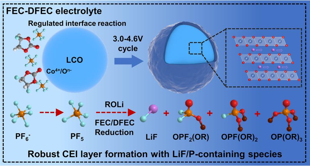 长期以来,钴酸锂(LiCoO2,LCO)一直是消费电子领域不可或缺的正极材料。通过提升钴酸锂电池的充电截止电压能够提升其放电比容量,在4.5-4.6 V(vsLi/Li+)的工作电压下,其放电比容量能够达到190-230 mAh g-1,能够极大拓宽其实际应用场景。然而,高工作电压下钴酸锂表面存在高氧化活性的Co4+/On-(0<n<2),目前商用的基于碳酸乙烯酯(EC)体系的电解液在4.3 V及以上电压会发生严重的氧化分解。同时,EC的氧化分解产物H+/H2O会...