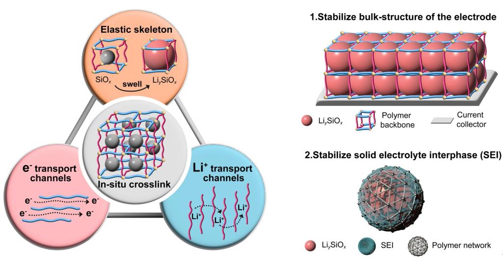 氧化硅(SiOx,0<x<2)材料以其高比容量和低氧化还原电位而著称,是石墨负极最有前途的替代者之一。然而,其实际应用受到循环过程中体积的大幅变化 (约翻倍)和其导电性差等因素的影响。我们之前的研究揭示了SiOx不受限制的膨胀-收缩过程导致固体电解质界面 (SEI) 增厚,并最终导致电子渗透网络的击穿(Nat. Comm., 2023, 14, 6048)。为了缓解这种情况,构建具有高机械强度的导电聚合物网络对于提升电池体系导电性和稳定SiO...