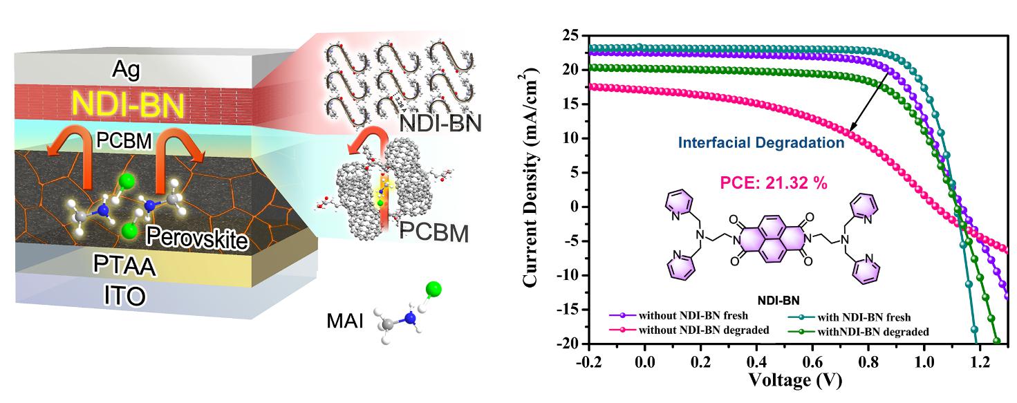 孟鸿教授课题组对有机界面材料抑制钙钛矿太阳能电池性能退化的机理进行了系统性的研究。